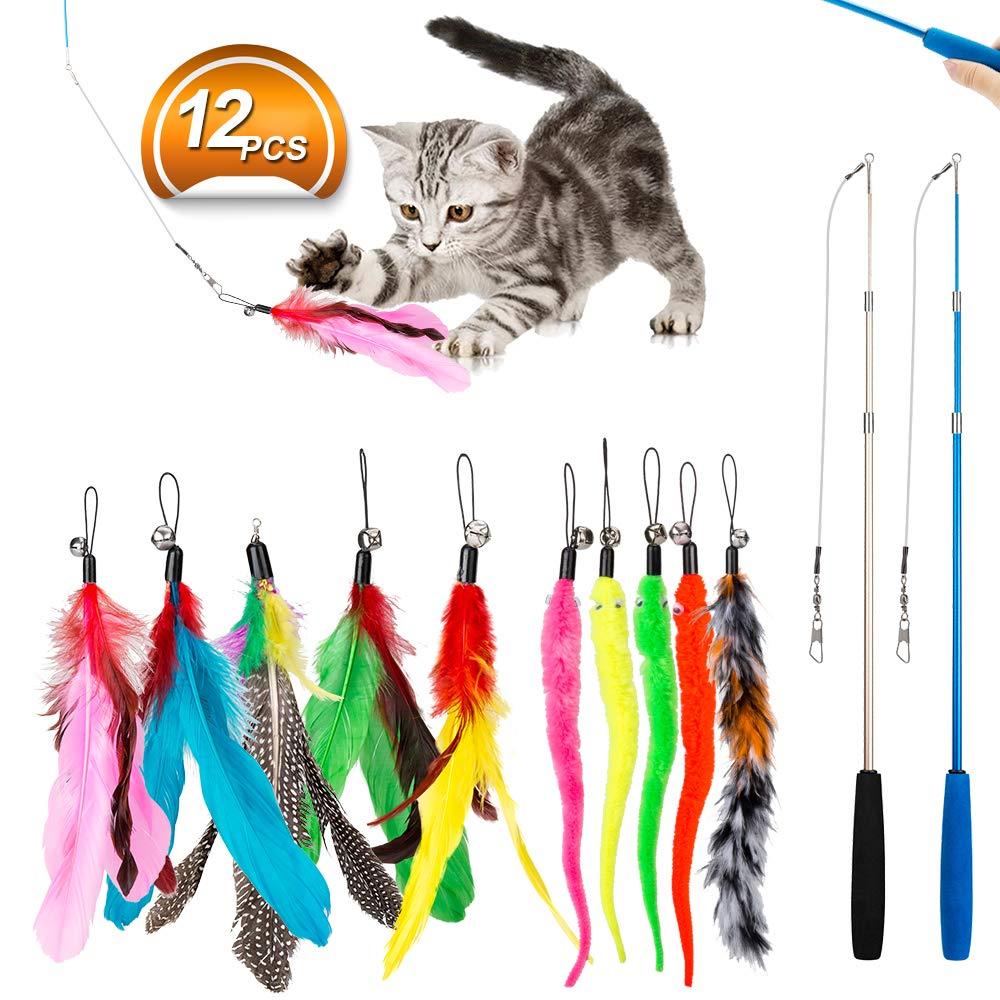 Feather Teaser Cat Toy, 2PCS Retractable Cat Wand Toys and 10PCS Replacement Teaser with Bell Refills