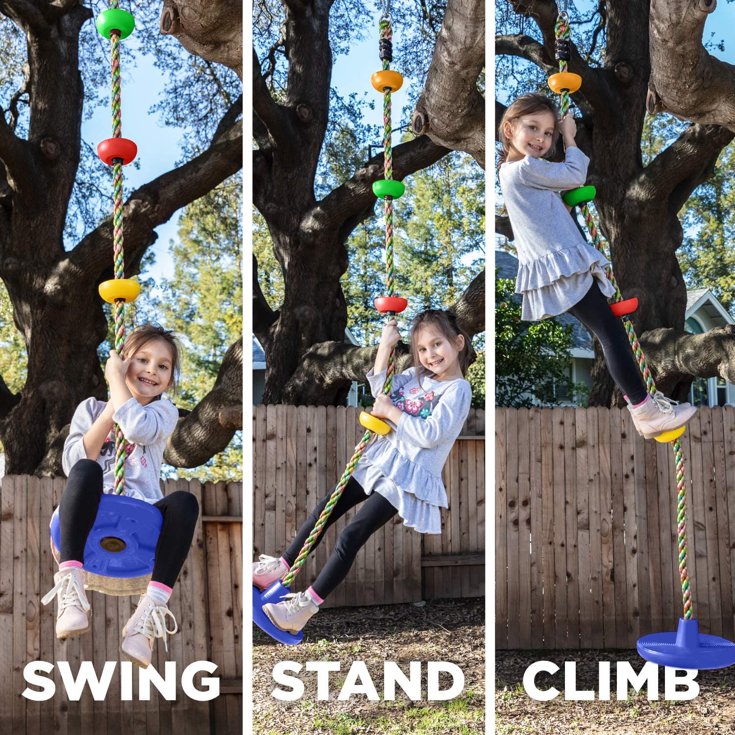 ✅ MULTIFUNCTIONAL: Swing-n-climb features a sitting disc and climbing rubber rings going up, enabling kids to sit or stand on to swing while also climbing up and down the rope. The unique design ensures that kids get the enjoyable energy burn-off they crave.